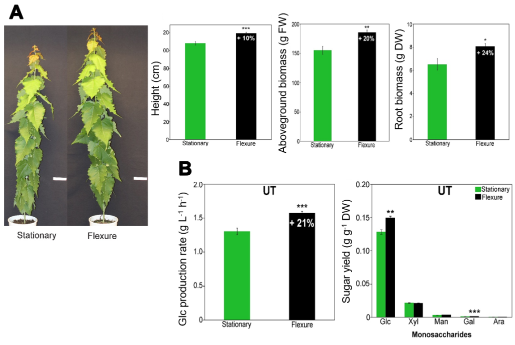 Plants are adapted to some dose of mechanical stresses that they encounter during their lifespan, including wind, snow, mechanical disturbance by animals, and earthquakes. These stresses induce a developmental programme called thigmomorphogenesis. In trees, mechanostimulation induces flexure wood. Properties of flexure wood and the molecular mechanism of its development are poorly understood. In this project we subjected hybrid aspen to low level stem flexing to investigate changes in growth, wood properties, and in transcriptomes and hormonome of developing wood. Flexure wood was shown to be a superior material for saccharification compared to normal wood and stem flexing stimulated overall plant growth (fig 1). Flexure wood formation involved changes in expression of hundreds of genes and an increase in jasmonates, suggesting that the jasmonate signaling pathway is involved in flexure wood formation. These results are promising and can be further explored to: i) improve saccharification yields in plantations and ii) to improve methods of plant growth in nurseries.