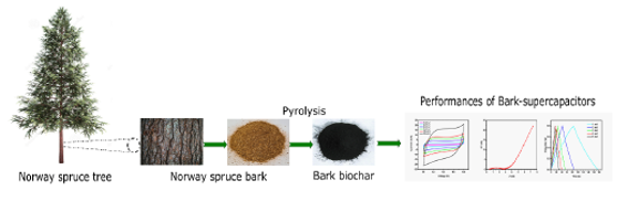 Preparing sustainable and highly efficient biochars as electrodes remains a challenge for building green energy storage devices. Herein, biochars were prepared from Norway spruce bark and lignin powder to be tested as electrodes for supercapacitors. Spruce bark was subjected to Accelerated Solvent Extraction using solvents with different polarities. After that, extracted and non-extracted biochars were prepared via a facile and sustainable single-step pyrolysis method, using H3PO4 as a chemical activant, and the influence of extraction on the biochar properties and the electrochemical performance was evaluated.